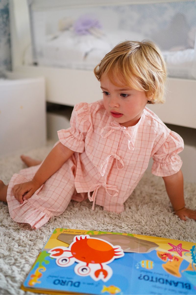 Confeccionado con algodón orgánico, este conjunto garantiza suavidad y transpirabilidad, ideal para el descanso de los bebés. Como es nuestro Pijama Rosa Bebe Matilda con los detalles de los lazos en la parte de arriba y sus mangas cortas un poco abullonadas. Su diseño es delicado y funcional, pensado para facilitar el movimiento y proporcionar una sensación agradable en la piel sensible de los niños. Además, el pijama algodon bebe incluye detalles que lo hacen único, como su cierre con lazos en la parte superior, que añade un toque especial y facilita el vestir al bebé.